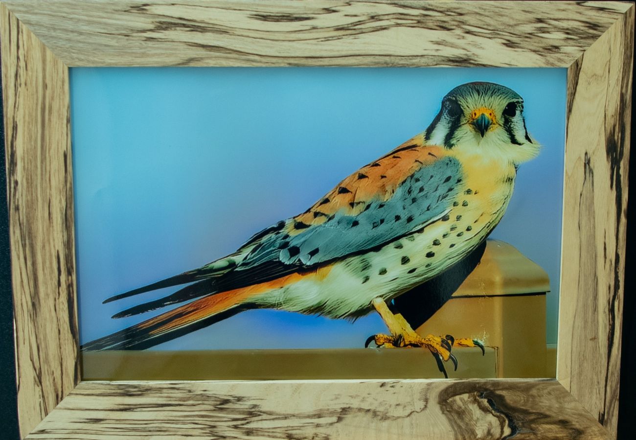 The outer dimensions of this framed print measure 15-3/4″ x 21-5/8″. The frame is Spalted Tamarind wood finished with clear lacquer and the image within the frame has a solid black background.