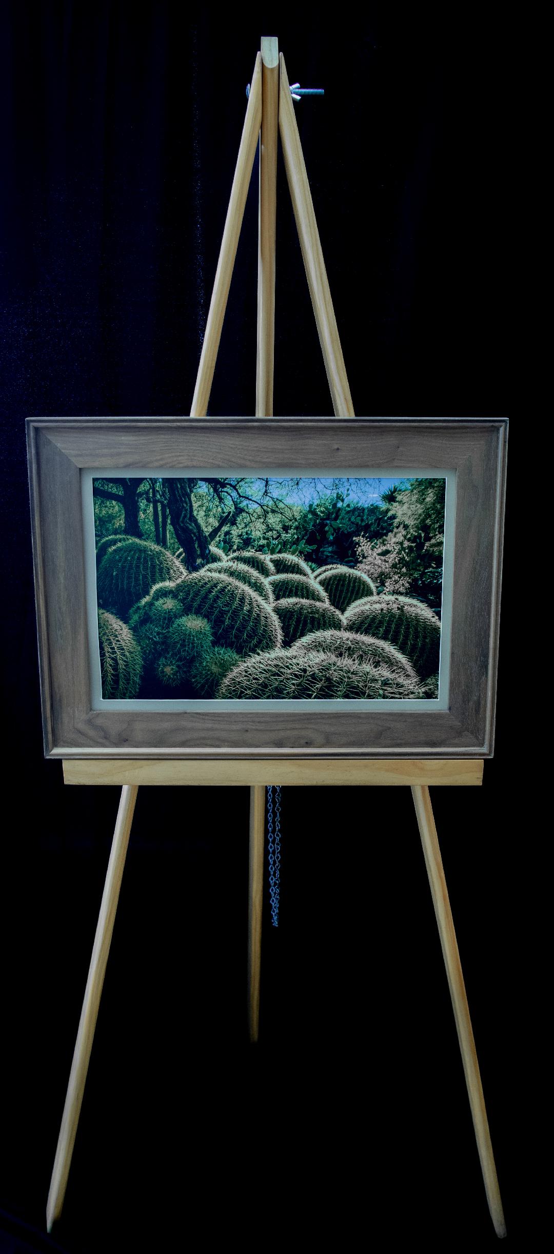 The outer dimensions of this framed print measure 17-1/4″ x 23-3/8″. The frame is Walnut wood with intricate routed grooves at the outer edges and small neutral colored splines in each rear corner of the frame. The picture is surrounded by a narrow, neutral colored mat board.