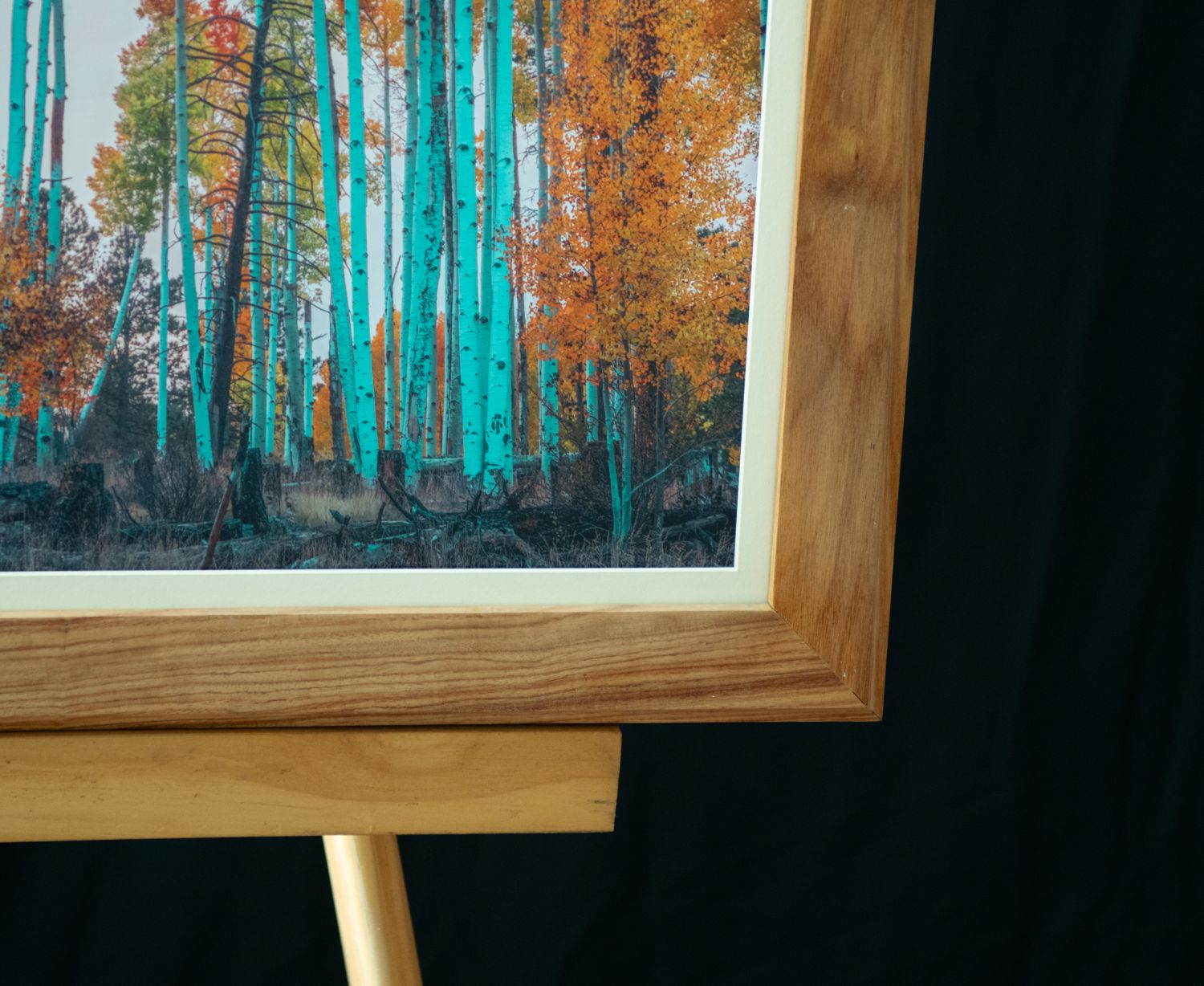 The outer dimensions of this framed print measure 23″ x 27″. The front of the frame is made odBolivian Rose wood and coved edging with a Canarywood back frame. It has a modest, neutral beige mat board.