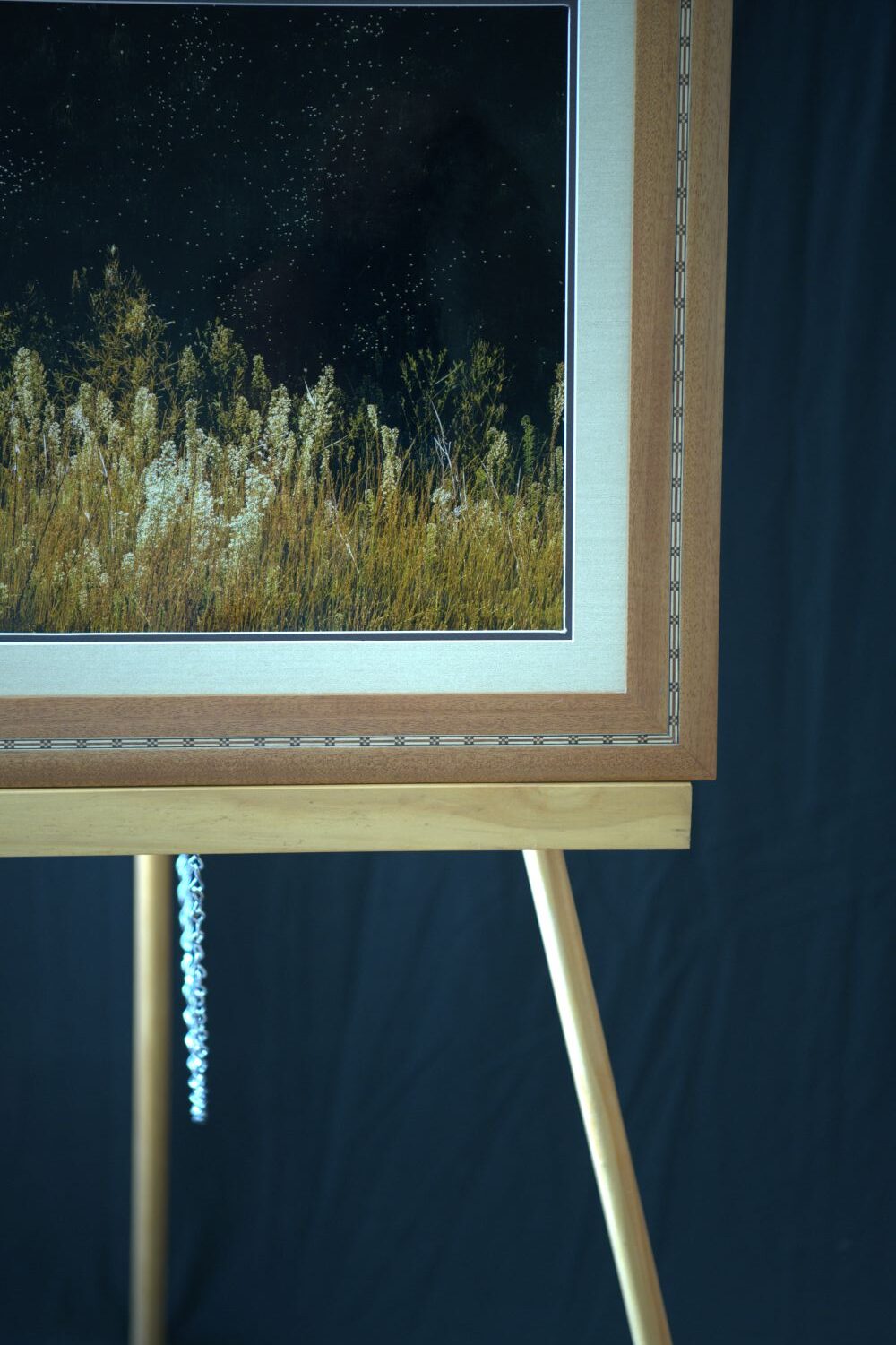The outer dimensions of this framed print measure 19-1/4 x 23-1/4″. The frame is Mahogany wood with an intricate, decorative inlay and a neutral colored double mat board.