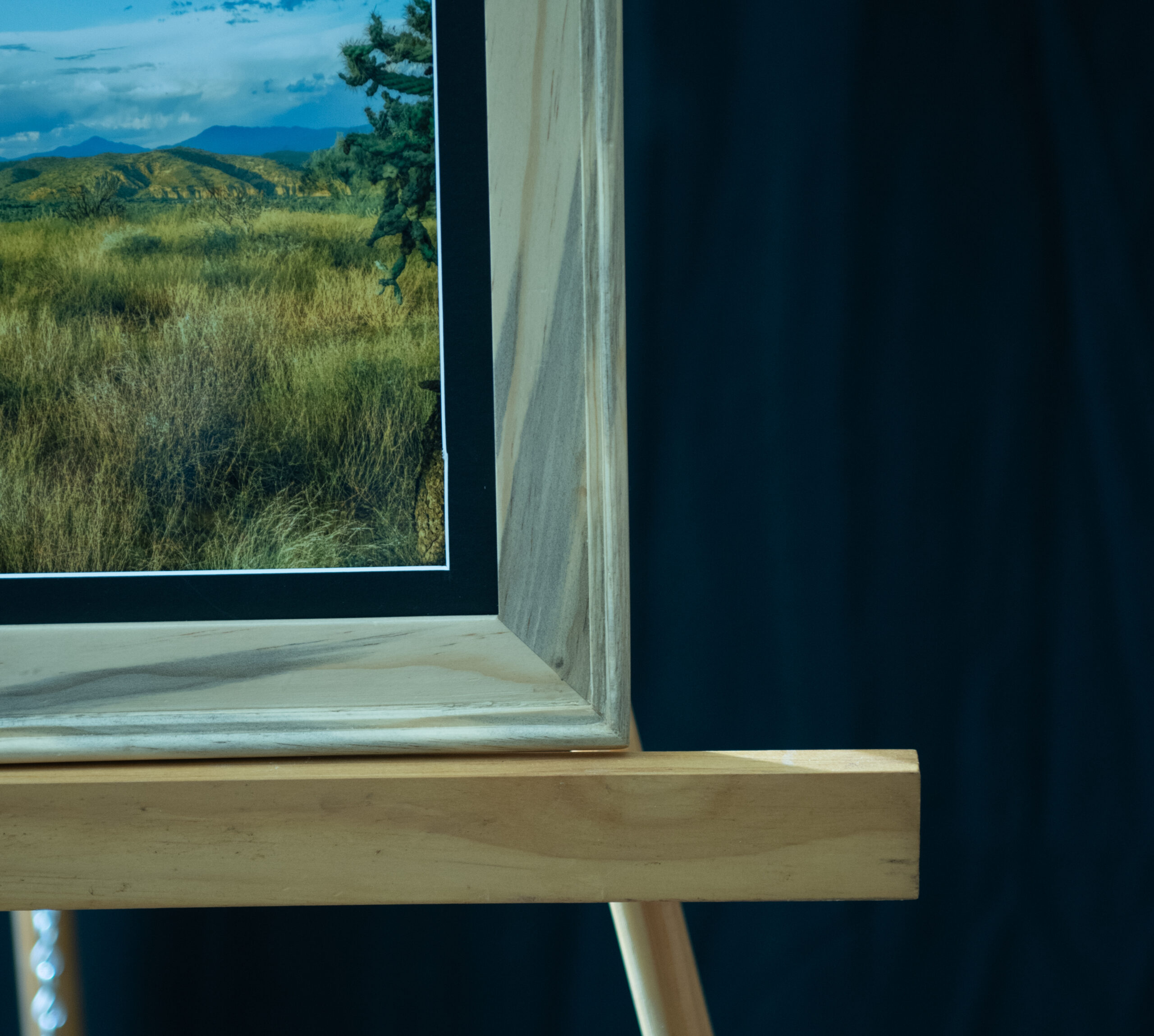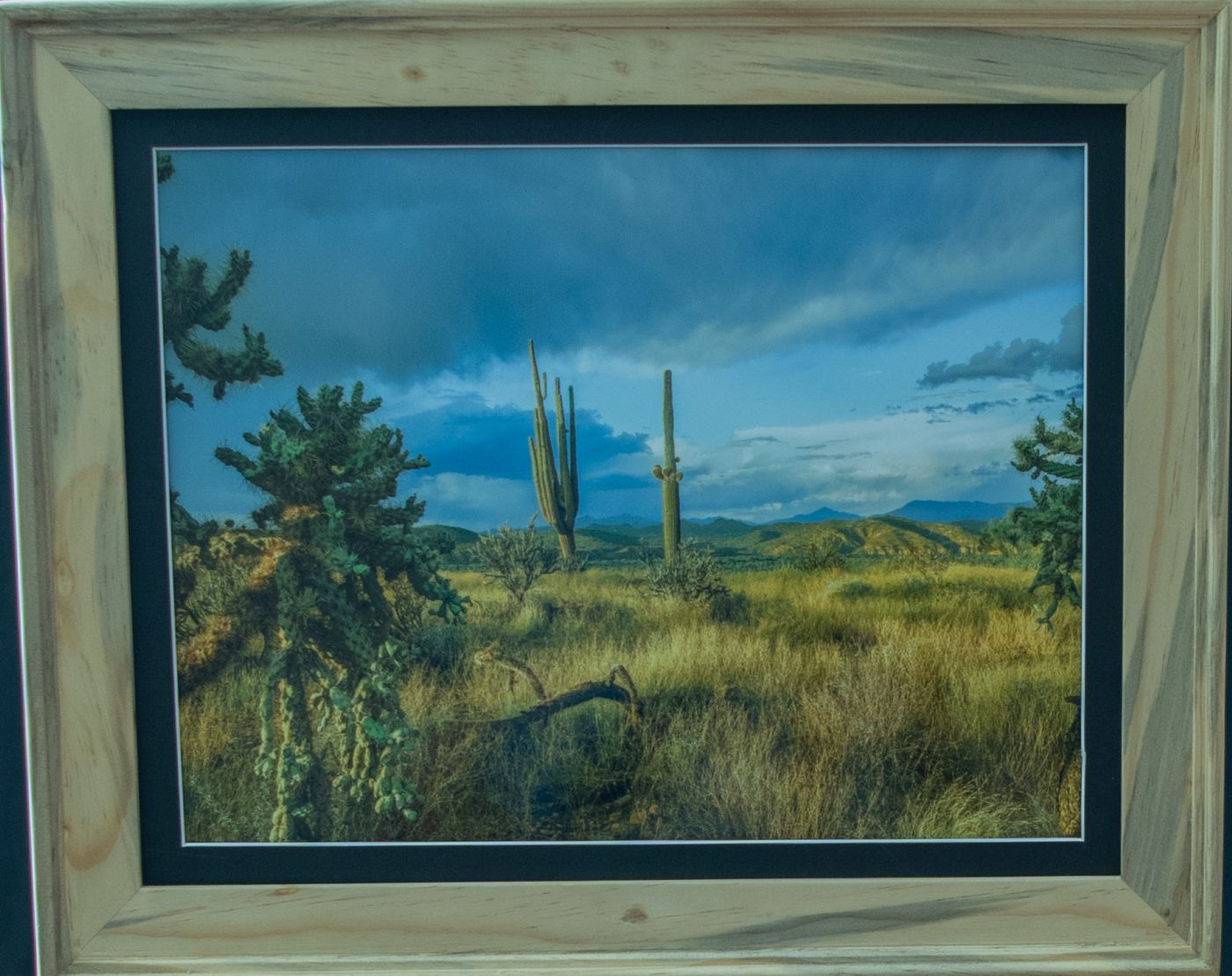 The outer dimensions of this framed print measure 13-3/8″ x 16-3/8″”. The picture is surrounded by black mat board within a Blue Pine wood frame. The frame has an outer trim and is finished in clear lacquer.