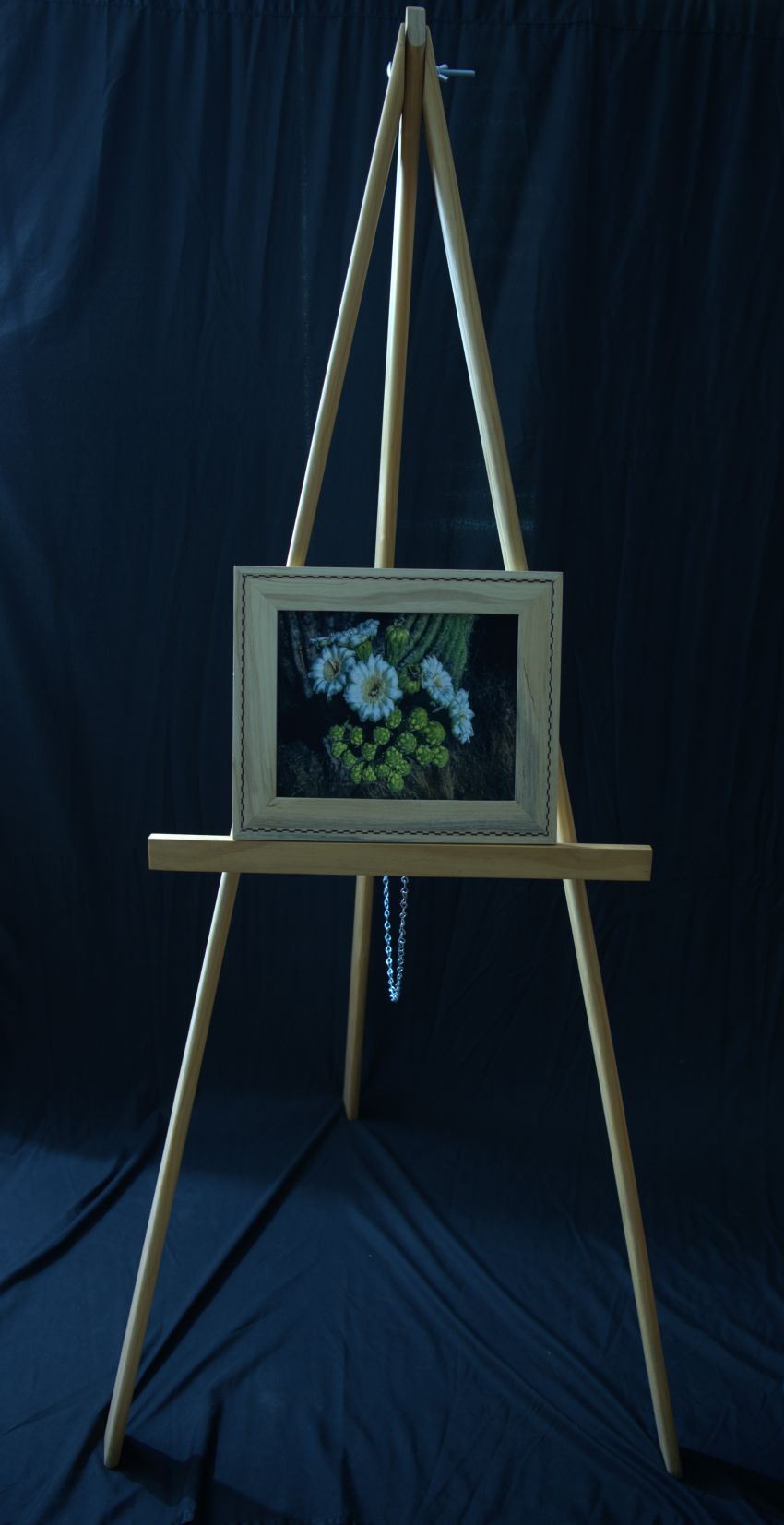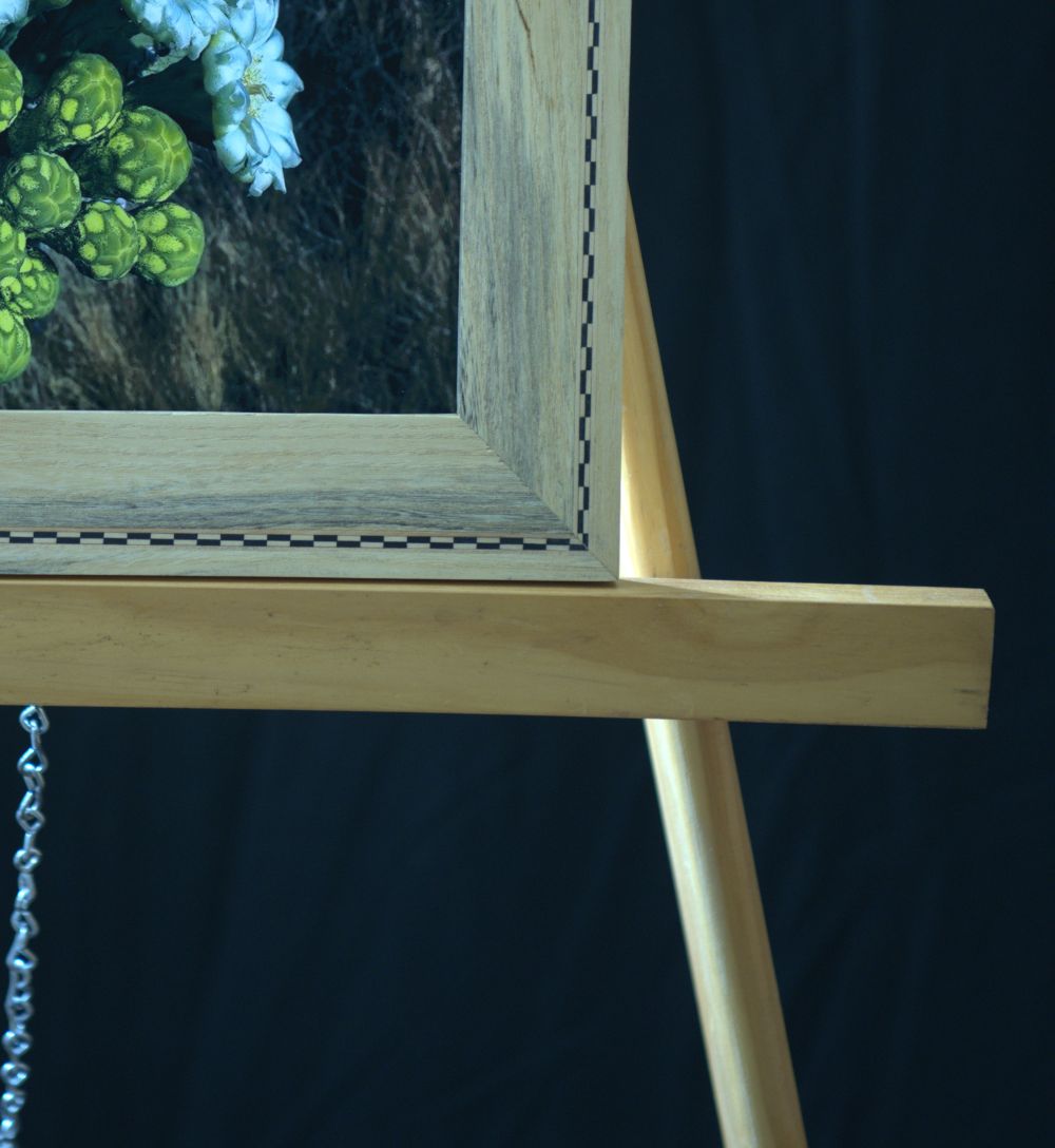 The outer dimensions of this framed print measure 11-3/4″ x 14″. The frame is stained Blue Pine wood with an intricate inlay towards the outer edge of the frame and a clear lacquer finish.