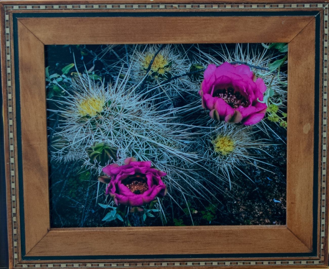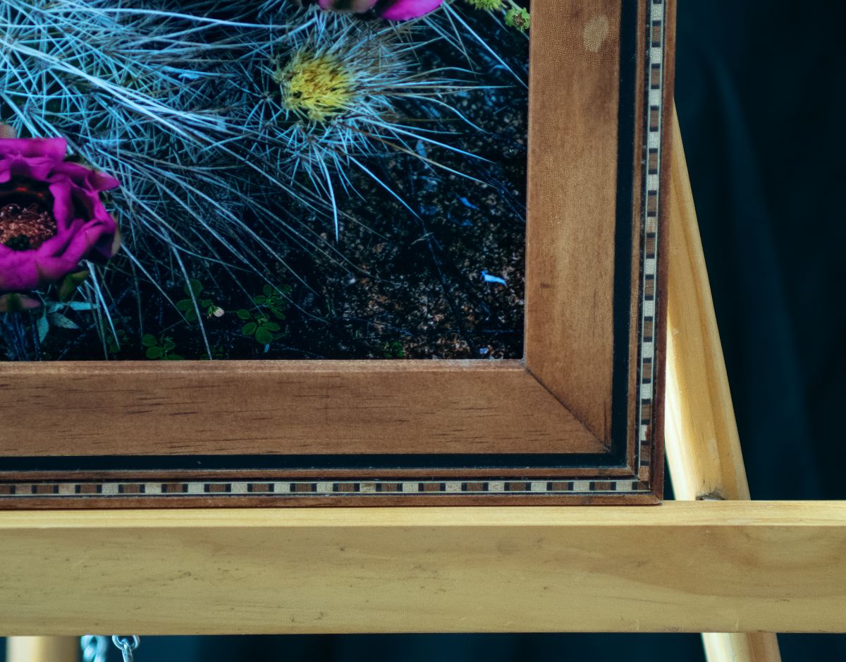 The outer dimensions of this framed print measure 10-7/8″ x 12-7/8″. The frame is stained Pine wood with an intricate inlay towards the outer edge of the frame and handpainted routed grooves next to the inlay.