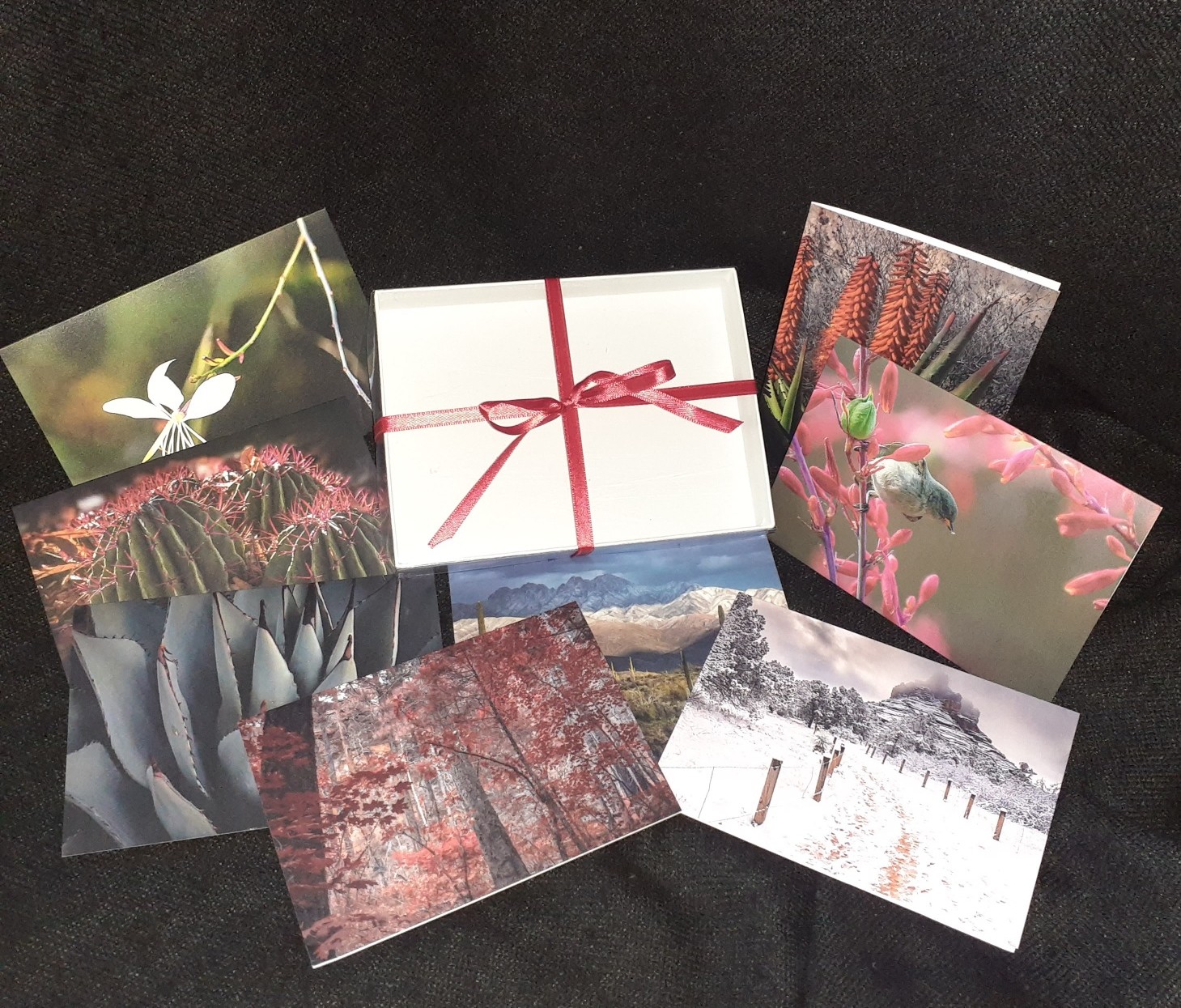 Boxed set includes one of each of these 8 Desert Canyon Photo images: Tiny bird, Black Spined Agave, Red Aloe flower spikes, snow covered road, Red Barrel cactus, white Bee Blossom flower, red forest, snow covered desert peaks.