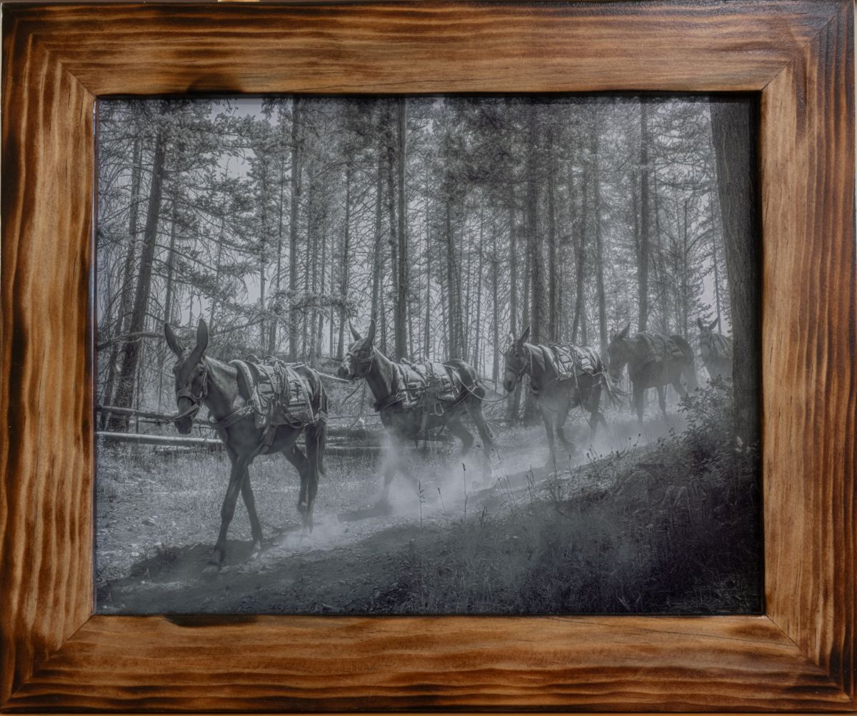 The outer dimensions of this framed print measure 14-3/8″ x 17-3/8″. The frame is stained Pine wood with a smoked pattern and is finished with clear lacquer.
