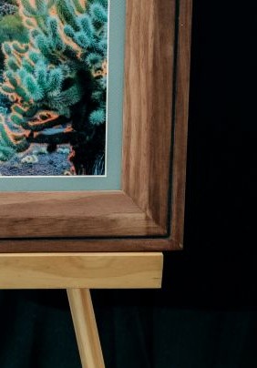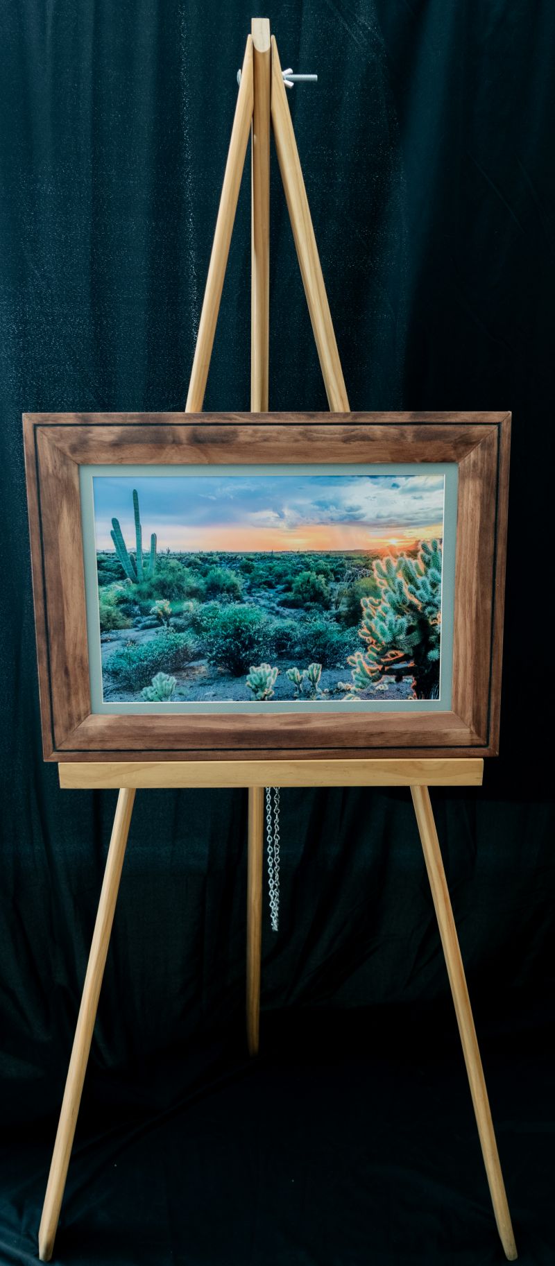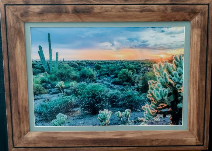 The outer dimensions of this framed print measure 17-12″ x 23-3/8″. The frame is stained Pine wood, recessed toward the inside with a routed, handpainted edge towards the outer edge. The picture has a modest, light blue-green mat board.