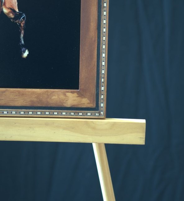 The outer dimensions of this framed print measure 14″ x 16-3/4″. The frame is stained Pine with routed, hand painted grooves and decorative trim towards the outer edges and the image has a solid black background.