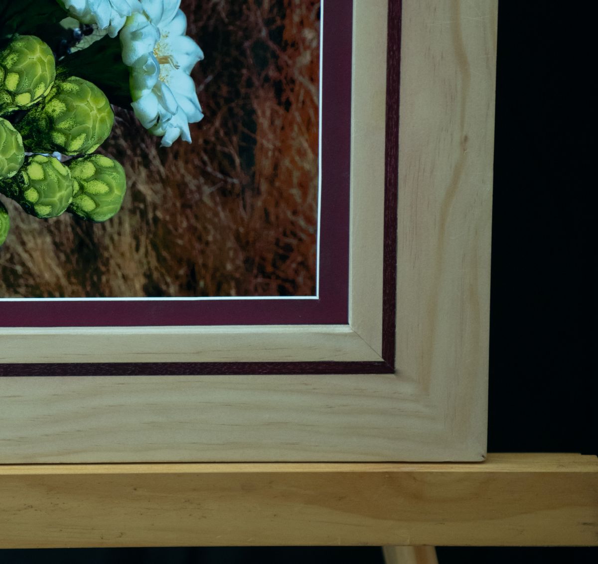 The outer dimensions of this framed print measure 15-1/2″ x 18-3/8″. The frame is Pine wood with a Purple Heart wood inlay and is finished with clear lacquer.