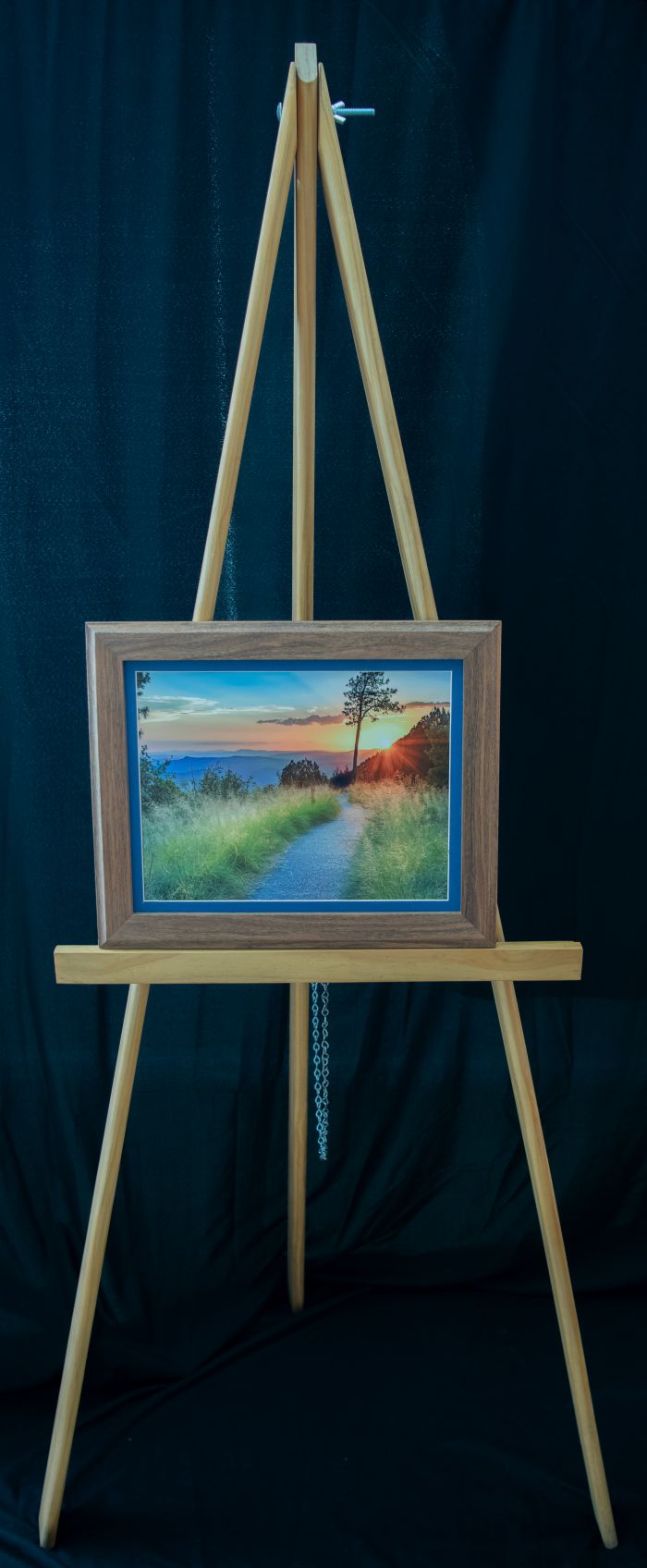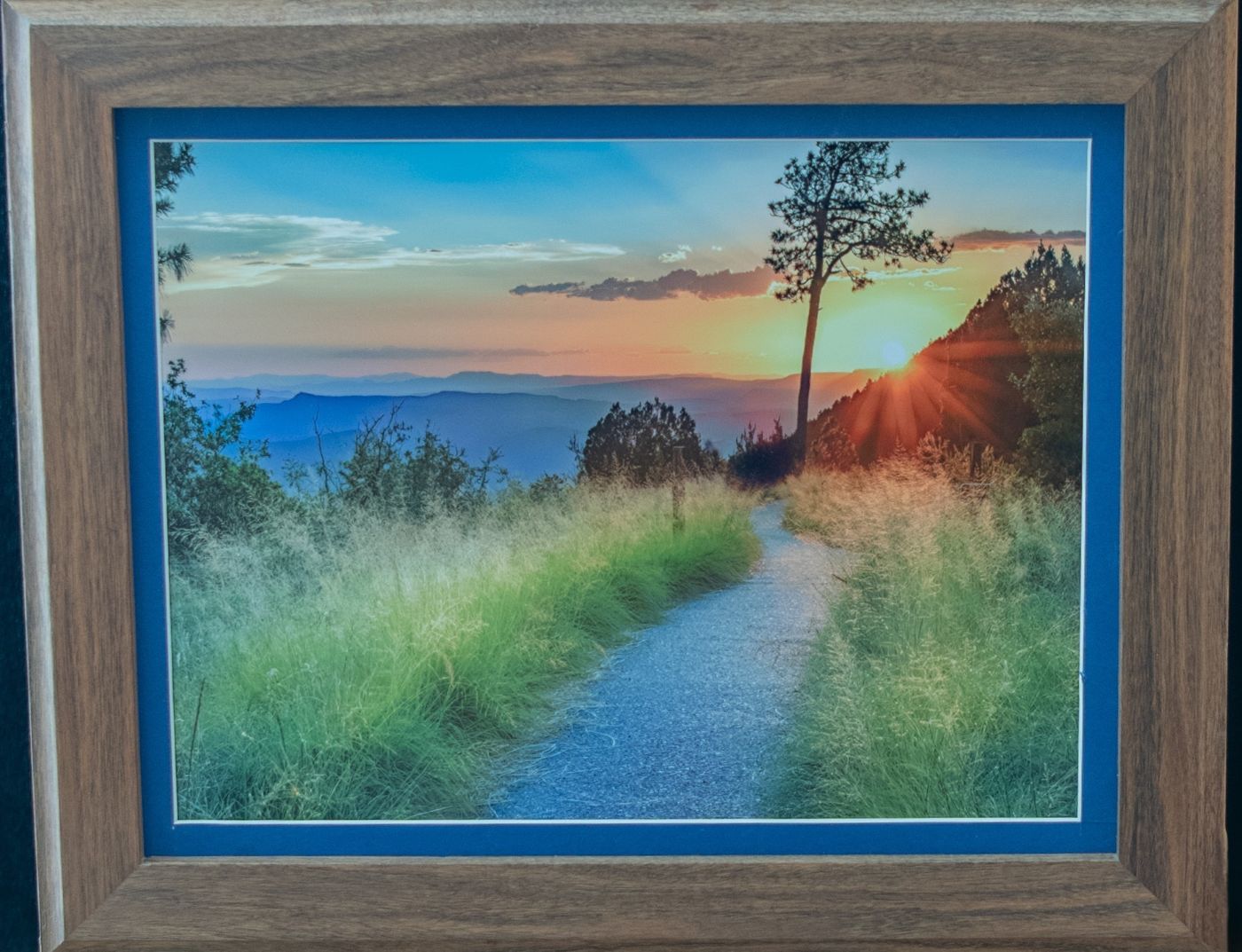 The outer dimensions of this framed print measure 13-1/2″ x 16-1/2″. The frame is Pategonia Rosewood with a Purple Heart wood inlay and is finished with clear lacquer. The picture is surrounded by a narrow, blue colored mat board.